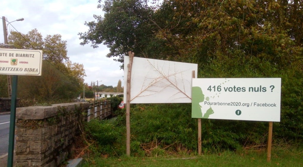 Des panneaux à la sortie d’Arbonne rappellent que le contentieux électoral est loin d’être apaisé. (Photo Michel GELLATO)