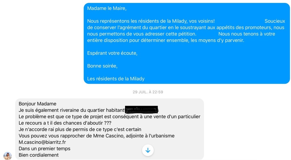 La mairie ne voit vraiment pas où est le problème : « Nous avons aussi imposé une modification du permis de construire et une sortie vers le bas pour éviter les accidents. Maud Cascino, l’adjointe à l’Urbanisme est partie au feu sur ce dossier et a réussi à convaincre tout le monde en réduisant le nombre de logements prévus et en obtenant une sortie nord pour éviter les accidents. La ville de Biarritz a un besoin vital de logements sociaux. (Face à cette affirmation, les riverains font encore des bonds. Le nombre de logements a été réduit pour la simple raison que plusieurs acquéreurs fortunés ont acheté 2 appartements chacun pour les réunir en un seul. La sortie Nord (vers la station d’épuration) mentionnée par la mairie n’est qu’une recommandation afin d’améliorer la sécurité, pas une obligation. En plus, cette route serait alors située sur une zone EVP (Espace Vert Protégé).