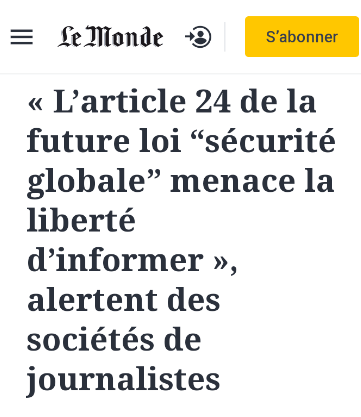– »Loi d’initiative sur la sécurité globale » en débat qui se traduira par l’entrave à l’information et la liberté d’expression et qui d’ores et déjà ouvre une porte à la surveillance par drones et à la mise en place de la reconnaissance faciale ?