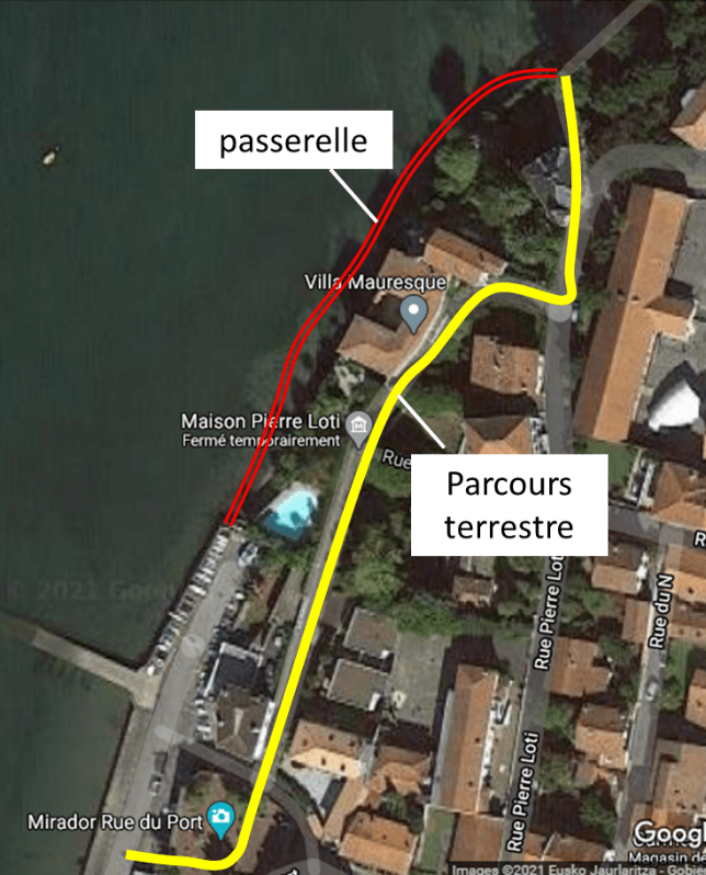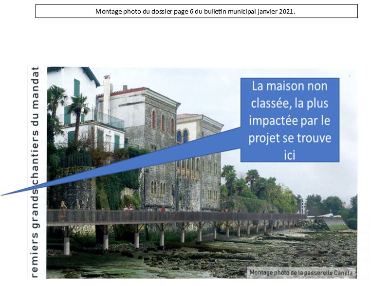 Il y a bien un troisième bâtiment, dont la résidente, Madame Pouchoulou voit son intimité fortement impactée par le projet, puisque la passerelle est au niveau de son jardin, mais, ce n’est pas si grave. D’abord sa maison n’est pas classée, et en plus, par une bienheureuse erreur de cadastre, la ville d’Hendaye s’est attribué la propriété de sa parcelle. Il faudra de nombreux coups de fil et deux lettres recommandées avec accusé de réception, pour que, 10 mois après, ce faux document soit corrigé.
