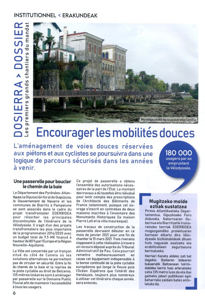 Extrait du Conseil municipal du 24 septembre 2020 : « N° 101.2020 – Mobilités douces – Résorption d’un point noir de l’itinéraire européen Vélodyssée – Création d’une passerelle entre Caneta et Pierre Loti …. sur rapports de Madame Chantal Kehrig Cottençon : « les usagers (environ 180 000 passages par an à vélo) se plaignent régulièrement de l’absence de continuité au droit de Caneta » 180 000 vélos par an !!! N’allez pas chercher ce chiffre dans la Guinness des records, il sort du chapeau de Kotte Ecenarro.