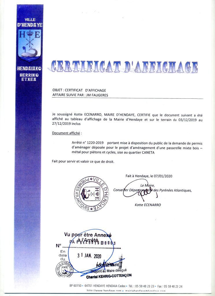 D’ailleurs la preuve irréfutable de l’existence de cet affichage est le certificat qu’a délivré Monsieur Kotte Ecenarro, maire d’Hendaye à Monsieur Ecenarro Kotte, afficheur, le 31 janvier 2020 .