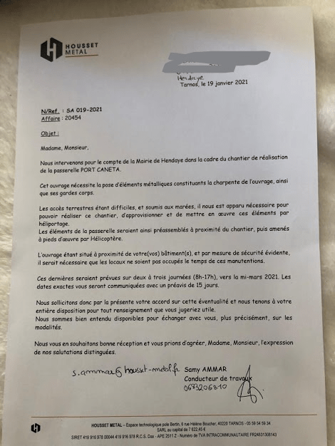 « Nous intervenons pour le compte de la mairie de Hendaye dans le cadre de la réalisation de la passerelle PORT CANETA » « les éléments de la passerelle seraient acheminés par hélitreuillage » « par mesure de sécurité évidente, il est nécessaire que les locaux ne soient pas occupés pendant ces manutentions » « ces dernières seraient prévues sur deux ou trois journées (8h à 18 h)»