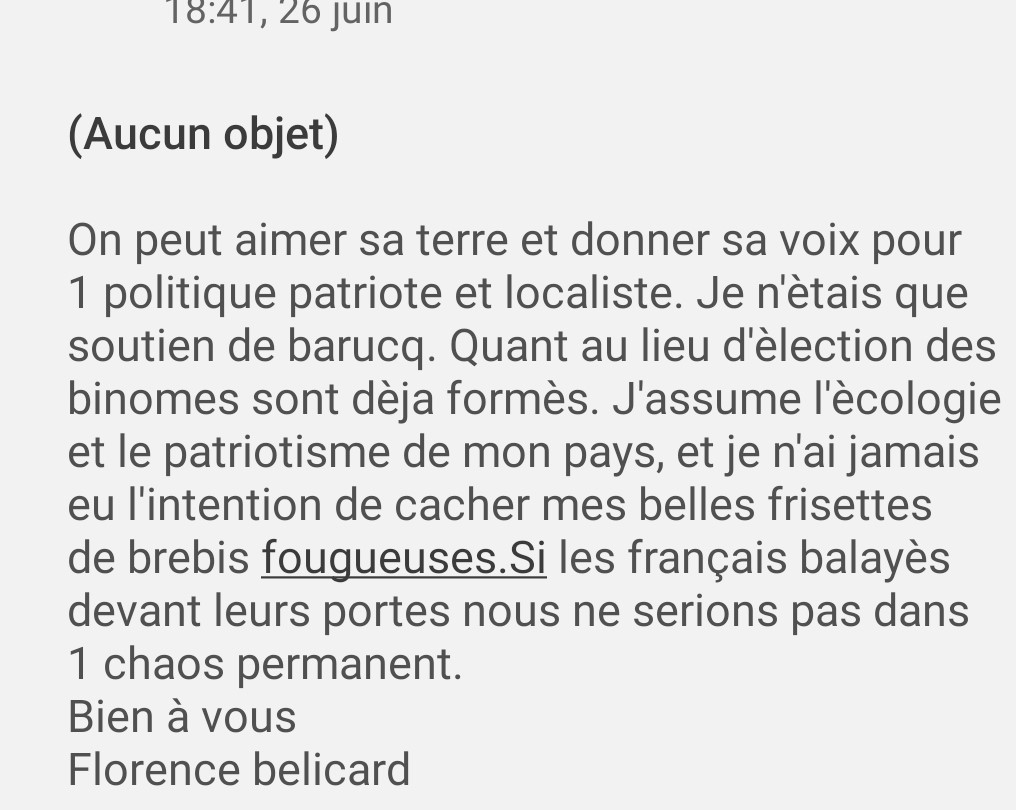 Trois semaines après la parution de cet article, la candidate malheureuse du Rassemblement national (13,6% des voix au premier tour sur le canton de Hendaye) nous a téléphoné pour nous dire qu’elle n’était pas colistière de Guillaume Barucq mais simplement soutien. Nous lui avons immédiatement proposé un droit de réponse, même si cette précision ne nous paraissait pas changer quoique ce soit au grand écart de cette acrobate des convictions. Nous avons reçu un SMS un peu confus, samedi dernier, à l’idéologie primesautière et à l’écriture plus exclusive qu’inclusive, mais n’avons jamais imaginé qu’il puisse s’agir d’un droit de réponse.