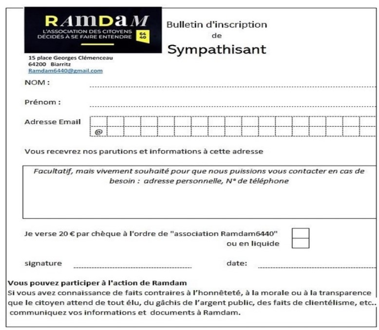 Vous avez envie de participer et avez le sentiment que vous allez beaucoup plus vous amuser qu’en achetant des tickets à gratter pour vingt euros. Le bulletin d’inscription ci-dessous est à nous renvoyer au nom de RamDam 64-40 , 15 place Clemenceau, 64200 BIARRITZ.