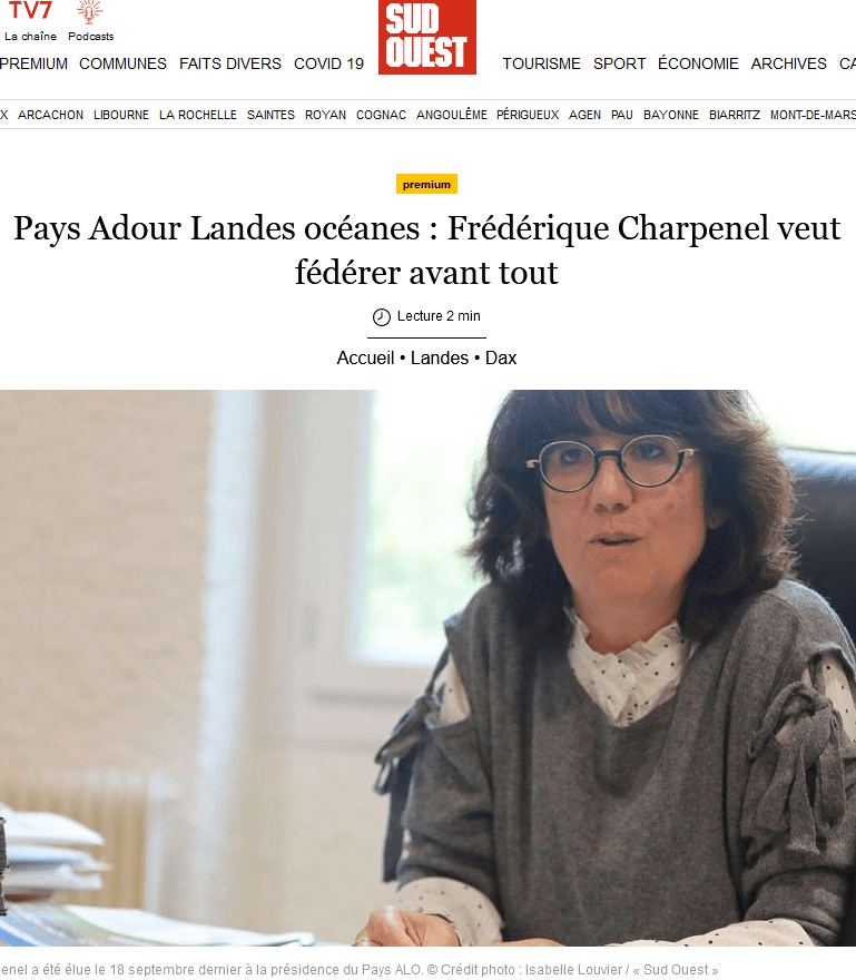 Histoire de complexifier davantage l’organisation territoriale et pourquoi pas de dépenser quelques sous du contribuable, Frédérique Charpenel entre autres déjà maire de Soustons, vice-présidente de la communautés de communes MACS et conseillère régionale, préside dorénavant aux destinés du syndicat mixte de l’ALO (Pays Adour Landes Océanes) qui regroupe quatre communautés de communes soit 75 localités. Une structure supplémentaire qui bien sûre va permettre »des études pertrinentes, des mutualisations et des économie d’échelle » (air bien connu de tout politique qui se respecte)