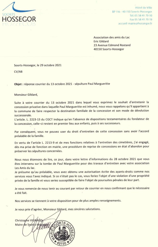 Vous avez dans vos connaissances une férue d’opérette qui à l’occasion de la Toussaint est allée fleurir la tombe de Luis Mariano au cimetière d’Arcangues. Malheur ! prenez vos jambes à votre cou, les Renseignements généraux sont déjà à vos trousses. Une association culturelle qui avait pris l’initiative pour la Toussaint d’entretenir la sépulture dans laquelle reposait depuis plus d’un siècle l’écrivain membre de l’Académie Goncourt Paul Margueritte qui ne semble pas avoir de descendant s’est vue adresser par le maire un rappel à l’ordre sous forme d’un surprenant catalogue de réglementations