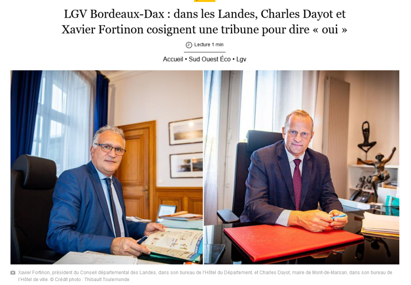 Le coût du prolongement de la ligne LGV Bordeaux Paris vers Toulouse et Dax est évalué à 14 milliards d’euros et pour sa part le département des Landes vient de voter sa participation à hauteur de 98,6 millions. Cette subvention a été validée avec un score sans appel 23 pour, 3 contre et 4 abstentions. Saluons au passage la position des conseillers du canton du Seignanx, Eva Belin et Jean-Marc Lespade qui bien que faisant partie de la majorité ont voté contre cette décision, contrairement à ce qui c’était produit pour le complexe golfique de Tosse (autre projet inutile et dispendieux financé par le conseil départemental des Landes)
