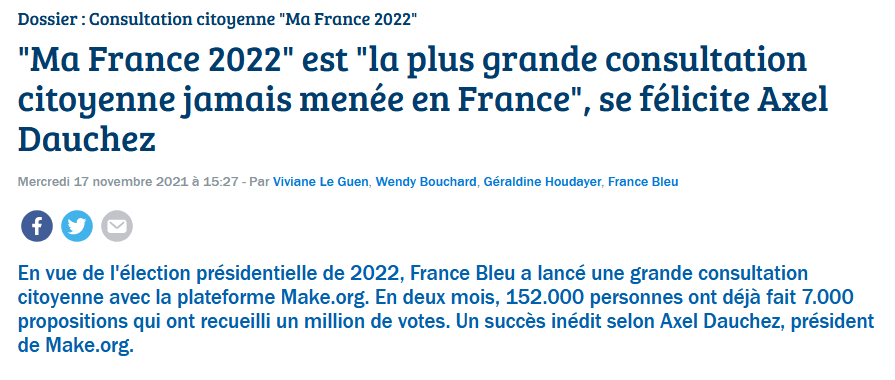 S’il fallait encore quelques raisons supplémentaires pour justifier l’action de Ramdam il suffirait de s’intéresser à la consultation citoyenne lancée par France Bleu en vue des élections présidentielles et intitulée ‘‘Ma France 2022 »