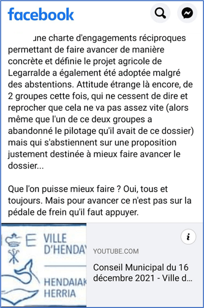 Flash-back : Kotte Ecenarro : « en février 2020, les agriculteurs ont signé un bail » Or, les agriculteurs n’ont jamais signé de bail mais une « convention pour mise à disposition » des terrains, convention révocable annuellement. Ce n’est pas du tout pareil. Lors du dernier CM le maire, se gargarisant du nouvel accord signé par les agriculteurs en remet une couche : « Ce bail signé pour une durée initiale de six ans, court jusqu’au 31 décembre 2025 ». encore une fois Kotte Ecenarro joue avec les mots. Les agriculteurs ont accepté (à leur corps défendant et faute de mieux) de signer non un bail, mais une « charte » sans valeur juridique, alors qu’un vrai bail agricole apporte une vraie garantie et pour 9 ans (et non 6) et c’est, évidemment, ce que les agriculteurs demandaient.