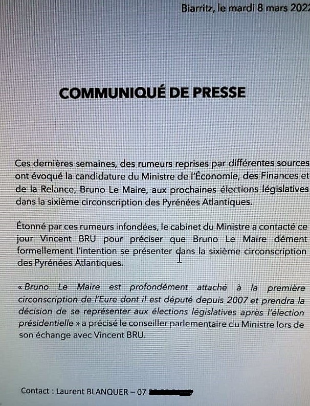 Récit de cette journée du 8 mars, mouvementée et riche en infirmations pour qui aime la géopolitique. Interrogée le matin par un confrère, l’occasionnelle élue du conseil municipal de Biarritz confirme avec réticences avoir été démarchée par l’entourage de Le Maire (Il n’y a que des mauvais esprits qui pourraient imaginer Nathalie-la-chaise-vide courir après le ministre). Las, une heure plus tard, un communiqué signé de Laurent Blanquer, l’attaché parlementaire de Vincent Bru, affirme que « le cabinet du ministre » (Vincent Bru n’a pas été jugé digne d’un coup de fil personnel du ministre des Finances) dément formellement « l’intention de se présenter dans la VIe circonscription des Pyrénées-Atlantiques ».