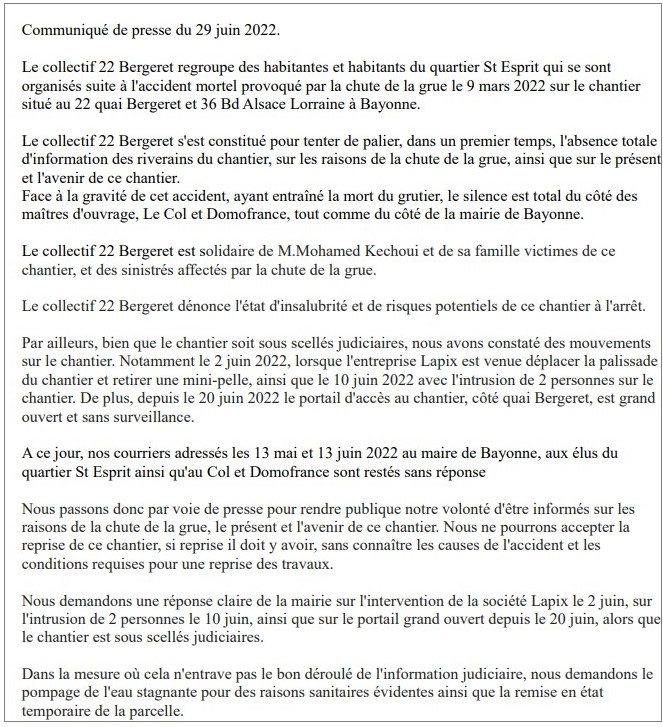 Cent jours après le décès d’un grutier dans le quartier Saint-Esprit à Bayonne, le Collectif 22 déplore que tous les courriers adressés aux élus soient restés lettres mortes.