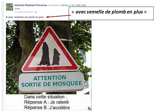 Il ne manquait pas d’esprit ce chef de secteur, Adolphe Raphael Ferreras qui, sans cacher qu’il était employé par la société de transport Translandes RRTL partageait sur Facebook la bonne blague au goût très sûr : devant une mosquée quel choix : « A ralentir, B accélérer » en soulignant son choix « B j’accélère avec semelle de plomb en plus ». Franche rigolade d’autant qu’il était chef de secteur en charge de chauffeurs routiers et scolaires. Tant d’esprit que le MRAP des Landes n’a pas apprécié :