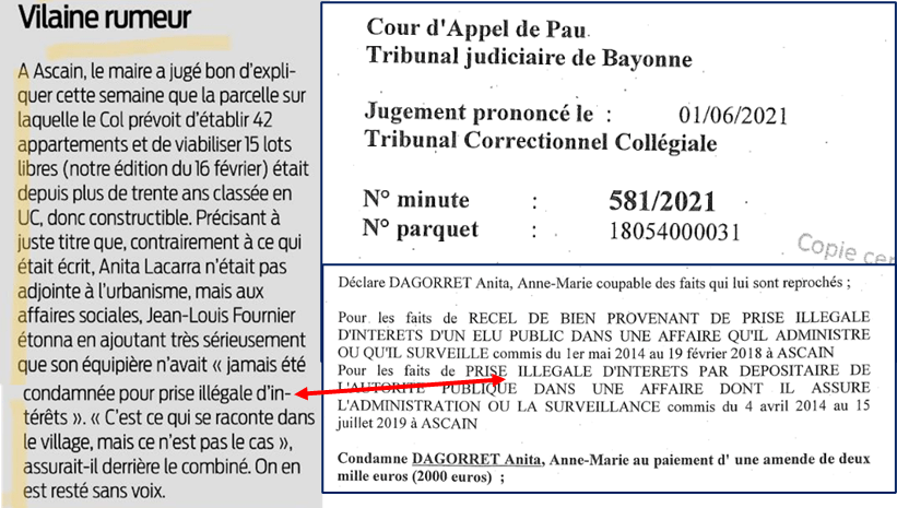 Las ! Tout devient trop voyant. Une association se forme, « Ascain Cadre de Vie » qui dénonce la prise illégale d’intérêt de notre Anita, qui sera condamnée en première instance puis en appel.