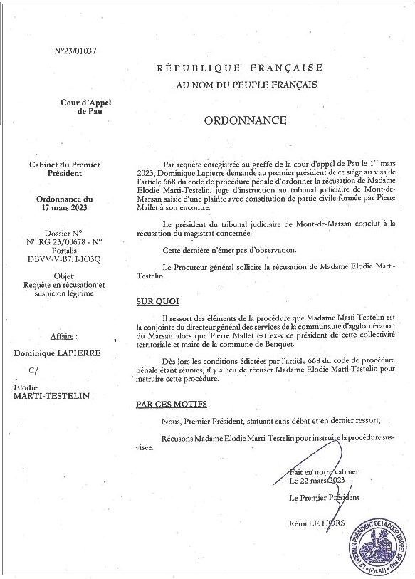 La Cour d’Appel de Pau vient de récuser la juge d’instruction de Mont-de-Marsan qui voulait à tout prix nous entendre, suite à une plainte en diffamation du maire de Benquet.