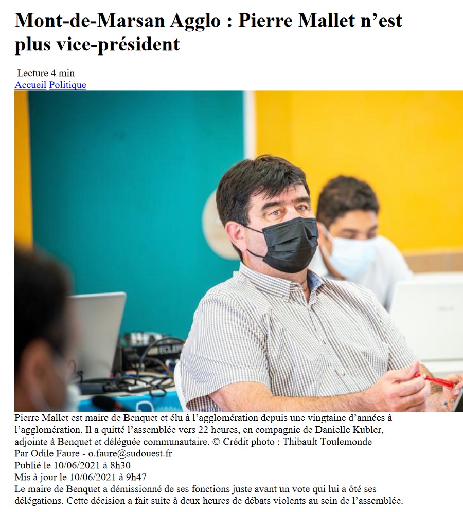 Lors du conseil du 9 juin 2021 effectivement Pierre Mallet a démissionné non par conviction mais par anticipation et opportunisme, pendant qu’était examinée une délibération le privant de ses fonctions de vice-président de l’agglomération.