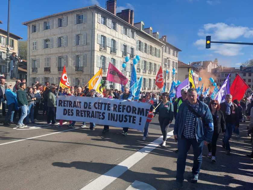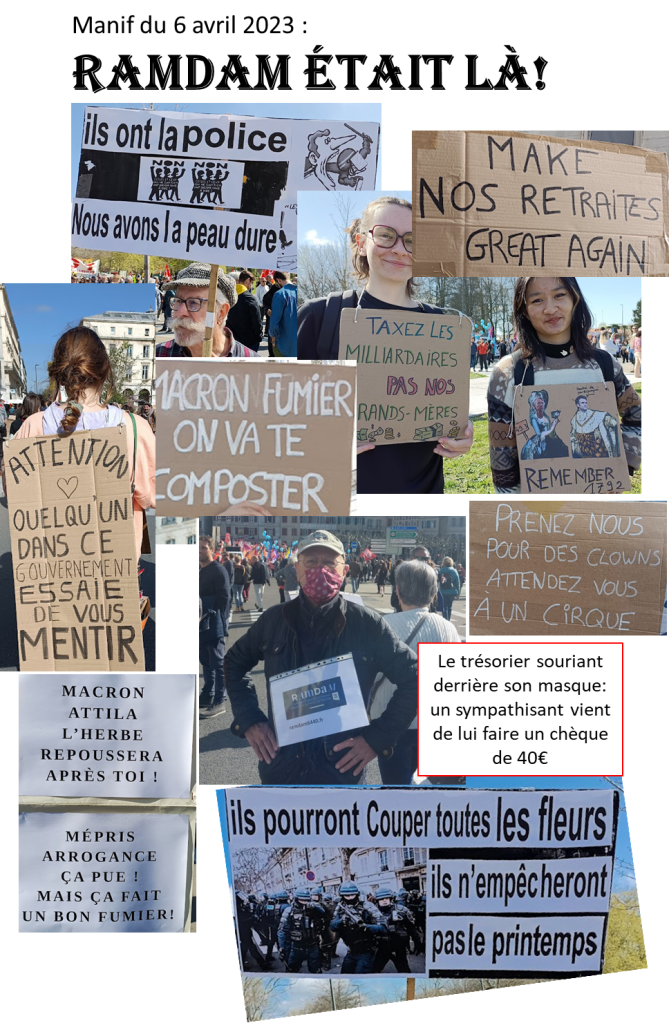 Pour cette onzième journée de mobilisation, les représentants de RamDam défilaient dans les rues de Bayonne, comme les dix fois précédentes. Ils ont noté la colère grandissante de la population face à la cécité du gouvernement et l’arrivée massive des jeunes dans les cortèges. Mention spéciale à une femme âgée, invalide sur sa voiture électrique, toute seule, et tellement courbée sur elle-même que l’on ne voyait pas son visage. Nous n’avons pas pu lui parler et pas osé la photographier.