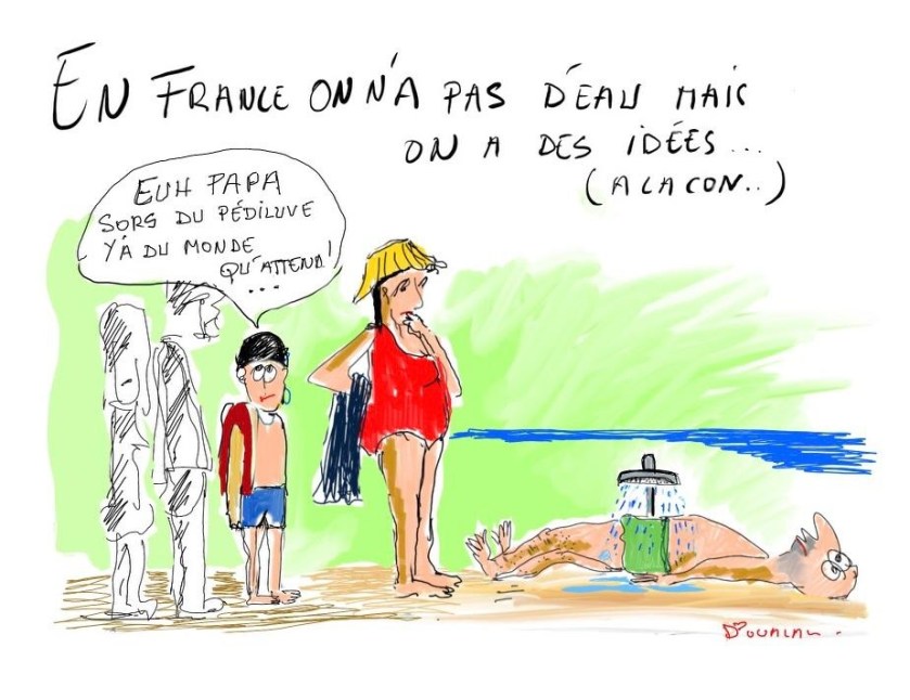 – Visiblement, les problèmes de robinet à l’époque où les doigts des écoliers se tachaient d’encre violette sont depuis longtemps oubliés par nos élus tellement décidés à sauver la planète. Une restriction d’eau pour économiser la ressource ? Magnifique ! Mais où est l’économie ? Au lieu de se doucher au sortir du bain, les gens devront se rendre chez eux pour la douche salvatrice et au final, pas une goutte d’eau ne sera économisée, la tentation étant grande de traîner longuement sous sa douche personnelle, quand la pression des estivants incite à faire douche brève sur la plage. Être en vacances, c’est aussi musarder, laisser défiler le temps sans consulter la montre, aller dépenser quelque argent aux terrasses des cafés. Une fois rentrés chez eux, les estivants ressortiront-ils ? On peut s’attendre à quelques grimaces du côté des commerçants locaux.