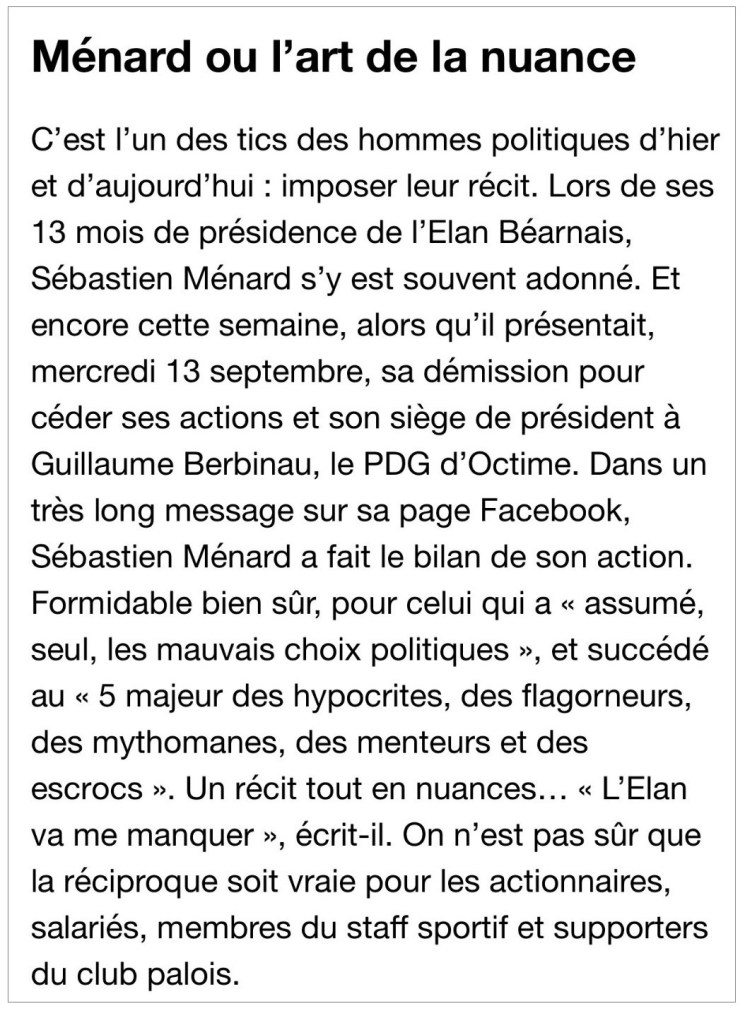 Sébastien Ménard, obscur conseiller municipal à Biarritz se revendiquant de l’amitié de Macron, nous avait donné il y a un an une interview houleuse dans laquelle il nous annonçait qu’on allait voir ce qu’on allait voir avec son arrivée à la présidence de l’Élan béarnais.