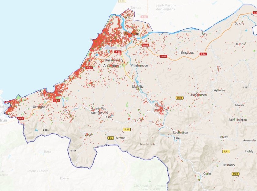 Non, la carte que vous avez sous les yeux ne représente pas l’invasion des punaises de lit au Pays basque, même si certains locaux ne font plus trop la différence entre les insectes nuisibles et les touristes qui viennent les envahir pendant la belle saison. Chaque point rouge de cette carte représente un hébergement proposé sur Airbnb par un propriétaire. Et il n’y a pas besoin d’être un grand statisticien pour constater que la Côte basque commence à avoir sérieusement la rougeole.