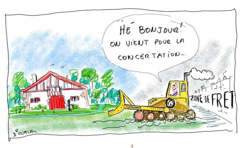 Le permis d’aménager (PA 064 407 23B002) de Mouguerre du 31 janvier 2024 officialisant cette opération nous a permis de lire les commentaires des soixante-six contributeurs retenus par cette PPVE. On y trouve trente-cinq Lahonçais, sept Mougertars dont trois de l’association « Mouguerre Cadre de Vie », dix-huit anonymes et six autres qui ont disposé d’un petit mois pendant les vacances de Noël pour jeter un œil et encore sans disposer de tous les documents dont certains sont arrivés le 19 décembre. Mis à part trois contributeurs favorables au projet, tous y sont opposés dont le conseil municipal de Lahonce, principal concerné.