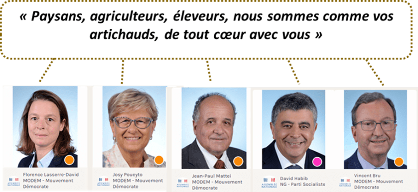 Soudain, Macron, ouvrant ses yeux devant les manifestations comme la marguerite ouvre sa corolle sous la pluie, annonce son amour et son désir de préserver les revenus des agriculteurs. Gloria Alleluia. Du coup les écolos rebondissent sur ces bonnes dispositions et lancent une proposition de loi « visant à garantir un revenu digne aux agriculteurs et à accompagner la transition agricole » (Scrutin public n°3653). Surprise : les députés macronistes votent contre et les Modems emboitent le pas. Pas question ! Ah ça mais, on n’obéit plus au chef ?
