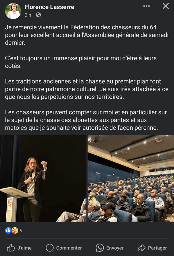 Question démagogie, notre députée locale n’a pas un appétit de moineau. Elle l’a prouvé en soutenant des chasseurs prêts à tuer des alouettes pour vingt grammes de chair fraîche.