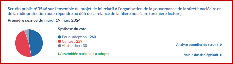 Le projet de loi est alors présenté à nouveau le 19/03/2024. Tout le monde mobilise le ban et l’arrière-ban, et 549 députés se présentent. Si certains se sont déplacés, semble-t-il un peu forcés et contraints pour faire plaisir au chef, d’autres, manifestement, se sont renseignés, et si la fusion est acceptée, ce n’est qu’à UNE VOIX près : (260 contre 259 et 30 abstentions. Scrutin 3546).