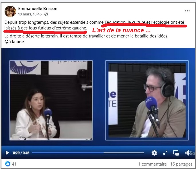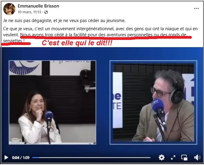 Extraits de la page Facebook d’Emmanuelle Brisson. les commentaires en rouge sont de notre cru.