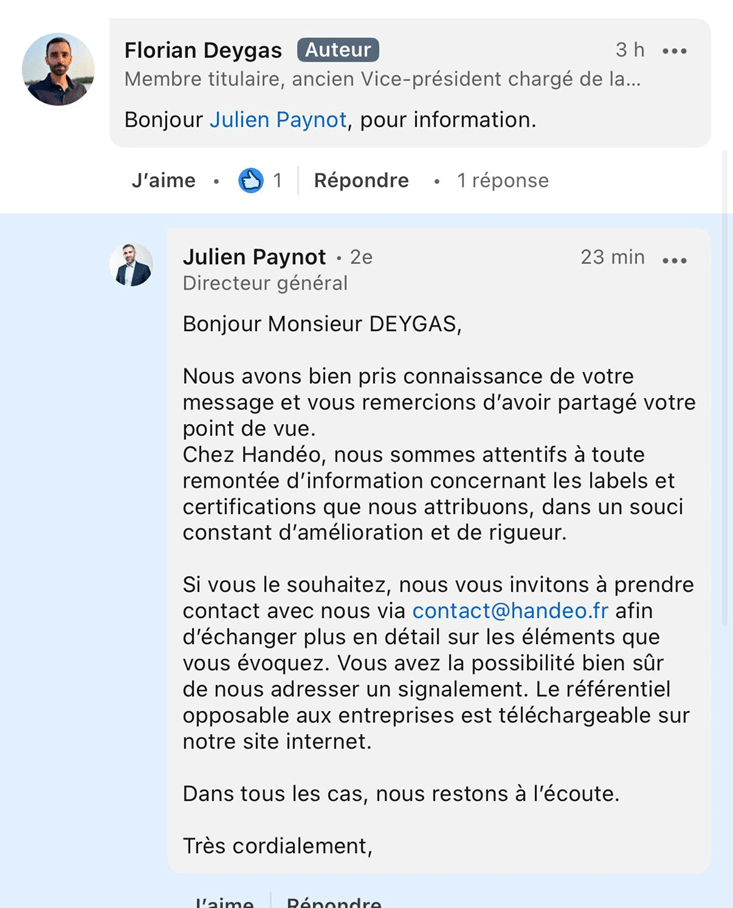 Il s’adresse aussitôt à Handeo qui lui assure : « Nous sommes attentifs à toute remontée d’observations concernant les labels et certifications que nous attribuons dans un souci constant d’amélioration et de rigueur »