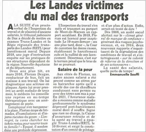 Un dossier qui dure depuis des années et qui a provoqué des dégâts humains que l’on a du mal à imaginer. Deux salariés licenciés ont fait des tentatives de suicide et d’autres sont encore en pleine tourmente judiciaire, contrairement à Florian Deygas, qui vient de l’emporter définitivement en cassation. Victime d’une sclérose en plaques alors qu’il était salarié de Trans-Landes, il avait été fermement poussé dehors, insulté et humilié, avec de lourdes allusions racistes à ses origines. « L’immigré, tu viens chercher tes tickets restau pour nourrir toute ta famille ? »