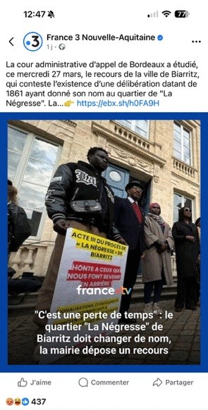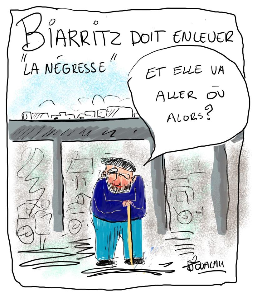 Trois groupes, de tailles très différentes, s’affrontent actuellement à Biarritz au sujet de la nécessité de rebaptiser le quartier de La Négresse. Une toute petite minorité, dont je fais partie, estime que ce nom raciste, sexiste, d’un autre siècle, doit être changé. Une grande majorité de Biarrots, nullement xénophobe, éprouve un légitime réflexe de nostalgie de l’enfance et ne voit pas pourquoi on devrait changer, même si dans un monde qui évolue sans cesse, on peut espérer qu’ils comprendront avec le temps la légitimité du combat mené par « Mémoires et partages ». Et puis, comme toujours quand il y a une polémique, un petit groupe de gros bourrins racistes profite de l’occasion pour s’en donner à cœur joie : « On va te mettre dans un coffre de voiture » « On va te jeter dans l’Adour », « On sait où tu habites. » et proférer des insultes indignes en 2025.
