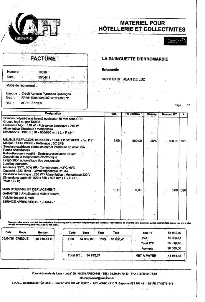 document 3&4) Facture du 05/04 2018 Fourniture matériel : AFT équipement : 65918,48 TTC