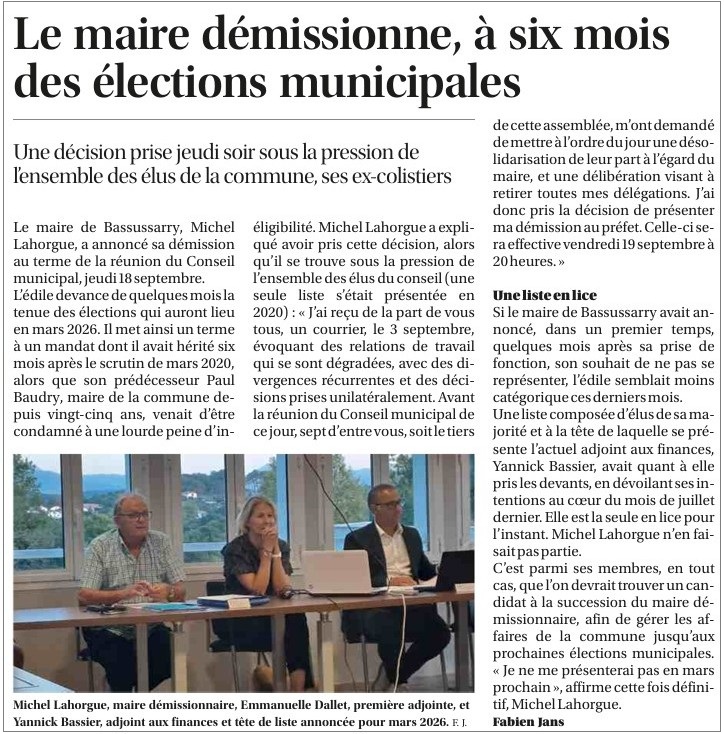 Ă Bassussarry, on pensait avoir dĂ©jĂ tout vu avec Baudry, champion du cumul acrobatique entre mairie, Agglo et emploi ibĂ©rique chez Vinci, jusquâĂ ce que Tracfin lui rappelle brutalement les lois de la gravitĂ©. AprĂšs son Ă©jection, on a hĂ©ritĂ© dâun maire intĂ©rimaire, Lahorgue, choisi surtout pour sa capacitĂ© Ă ne faire de lâombre Ă personne, mission parfaitement accomplie.