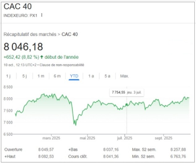 Le coût de « l’indécision politique a été chiffré à 9 milliards de produit intérieur brut de moins cette année » d’après Patrick Martin patron du Medef. Comme je possède quelques actions distribuées par mon ancienne société, je me suis cru ruiné ! Aussitôt, pour voir l’ampleur des dégâts, je me connecte sur Boursorama … qui me rassure : non, depuis le début de l’année le CAC 40 a gagné presque 9 %.