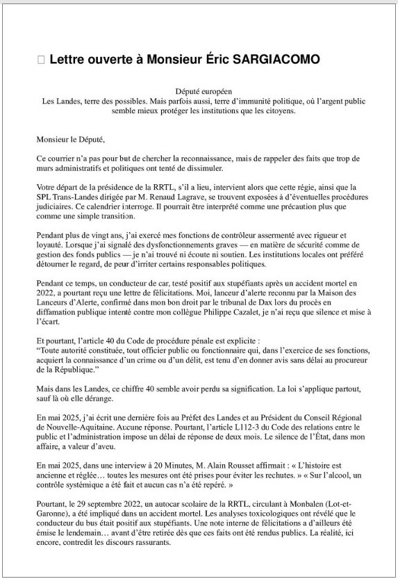 Les belles déclarations ne cachent pas la réalité : il ne suffit pas de se peindre « socialiste », il faut le montrer, sinon, on ment. Se déclarer proche des gens, il faut le démontrer sinon, ça sonne creux comme les ténèbres. Et pour ajouter encore à ces ténèbres, nos socialistes landais sont champions. Voici une nouvelle lettre ouverte, envoyée comme une bouteille à la mer à Éric Sargiacomo député socialiste Européen par un lanceur d’alerte landais, Monsieur Jésus Martins, qu’aucun politique n’a voulu écouter.