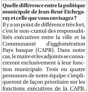 S’ils sont élus, Jean-Claude Iriart et ses adjoints se consacreront uniquement à la gestion de la ville de Bayonne, et enverront trois ou quatre autres élus pour ne s’occuper que de la CAPB. Depuis le temps que RamDam 64-40 réclame cette mesure qui relève du pur bon sens !