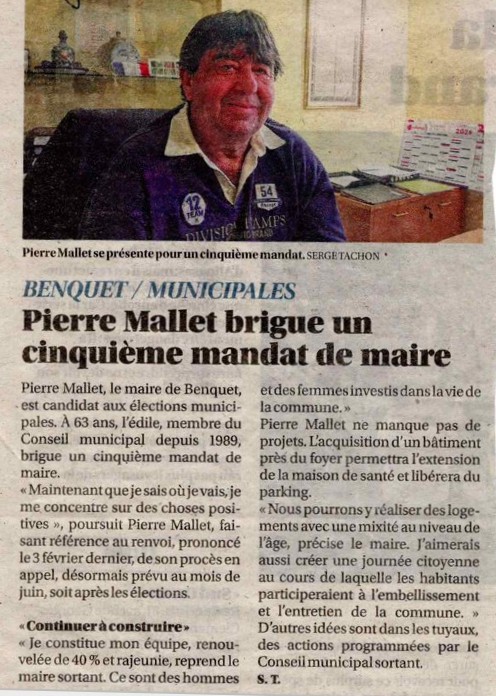Le procès a donc été reporté au 2 juin. Ce qui permet à Pierre Mallet de se présenter aux élections municipales pour un cinquième mandat et de fanfaronner dans « Sud Ouest » (9/2) : « Maintenant que je sais où je vais, je me concentre sur des choses positives ». Les électeurs de Benquet prendront-ils le risque de réélire un maire qui pourrait se retrouver obligé d’abandonner la partie trois mois après son élection ?