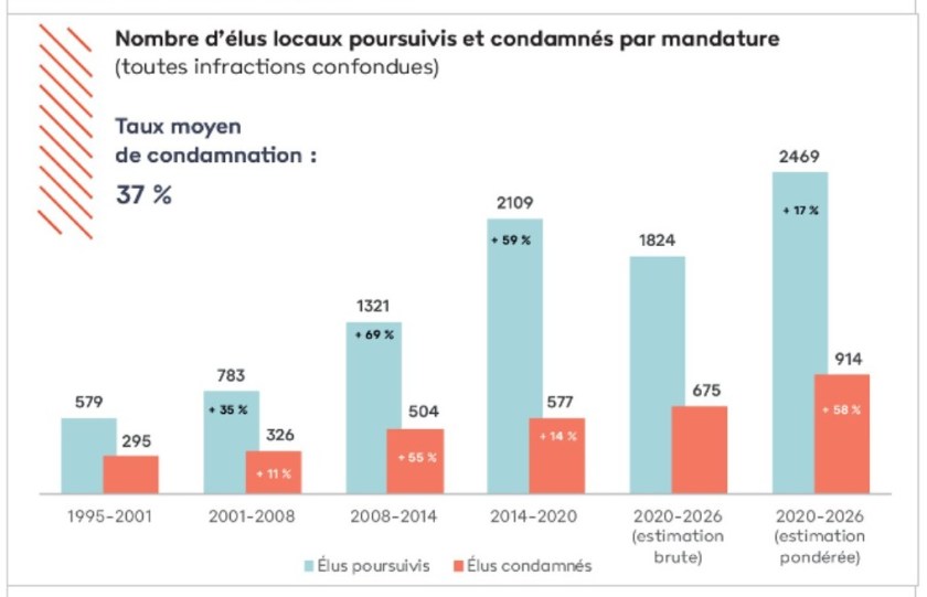 D’après nos estimations, un nouveau record devrait être atteint sur la mandature 2020-2026 avec près de 2 500 élus mis en cause soit une hausse de 17 % par rapport à la précédente mandature qui constituait déjà un record.