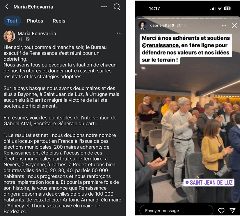 En regardant mieux, le message de la secrétaire du parti renaissance parle d’élus, certainement dans une des listes d’opposition, mais en aucun cas de maires, ni à Urrugne, ni à Saint-Jean-de-Luz. Quant à la photo, le bandeau rajouté peut faire croire à une réunion politique. Assister à une réunion de Gabriel Attal dans le cadre de son travail n’a rien de suspect et n’est pas une adhésion.